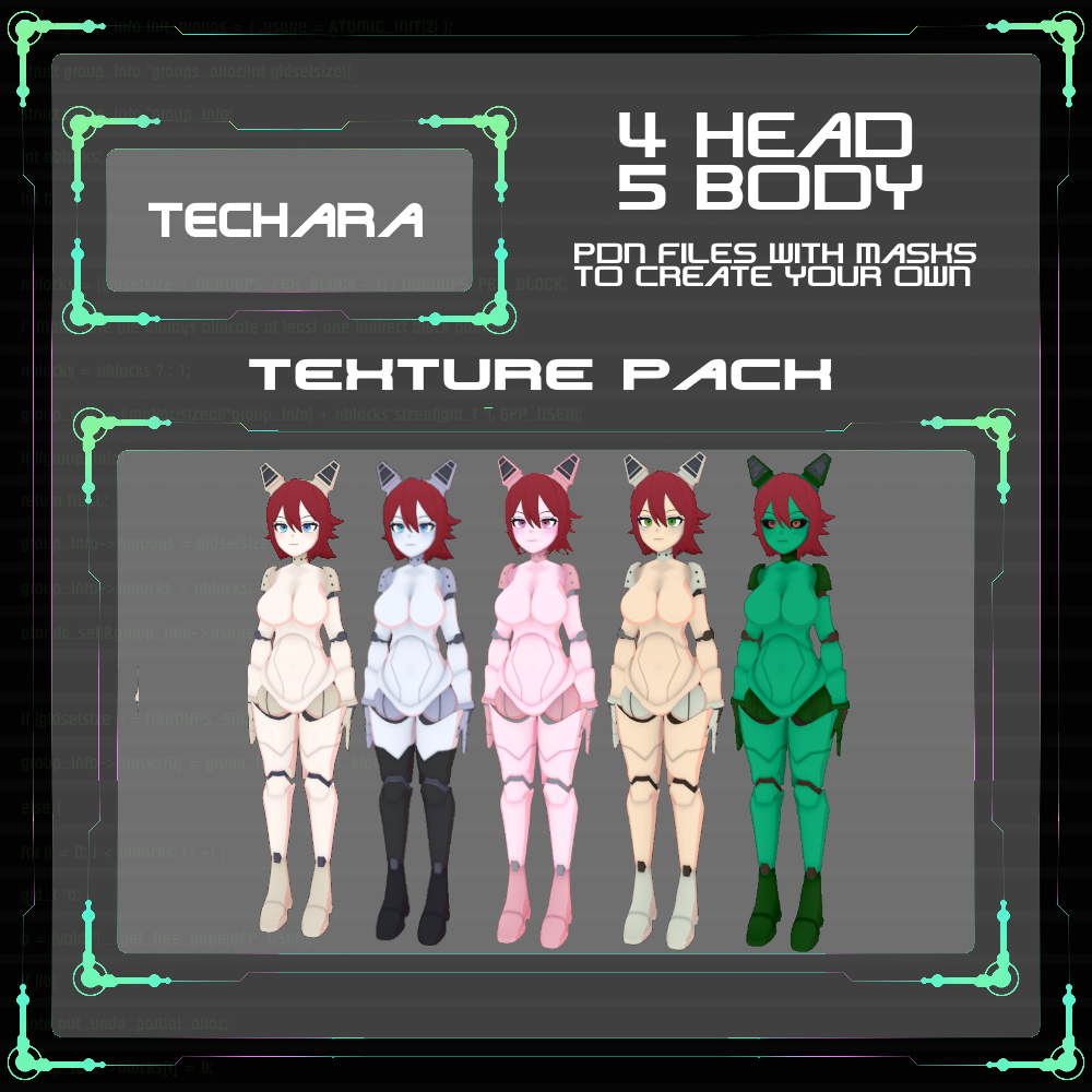 this is a texture pack file for my avatar techara to add more personification which can be found here https://tisbee.gumroad.com/l/Techara